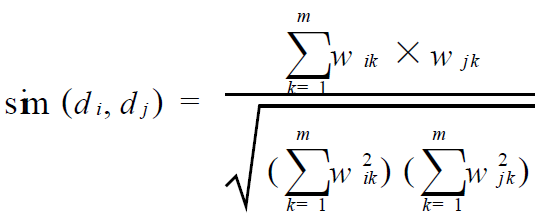 其中di为新文本的特征向量,dj为第j类的中心向量,m为特征向量的维数,wk为向量的第K维。